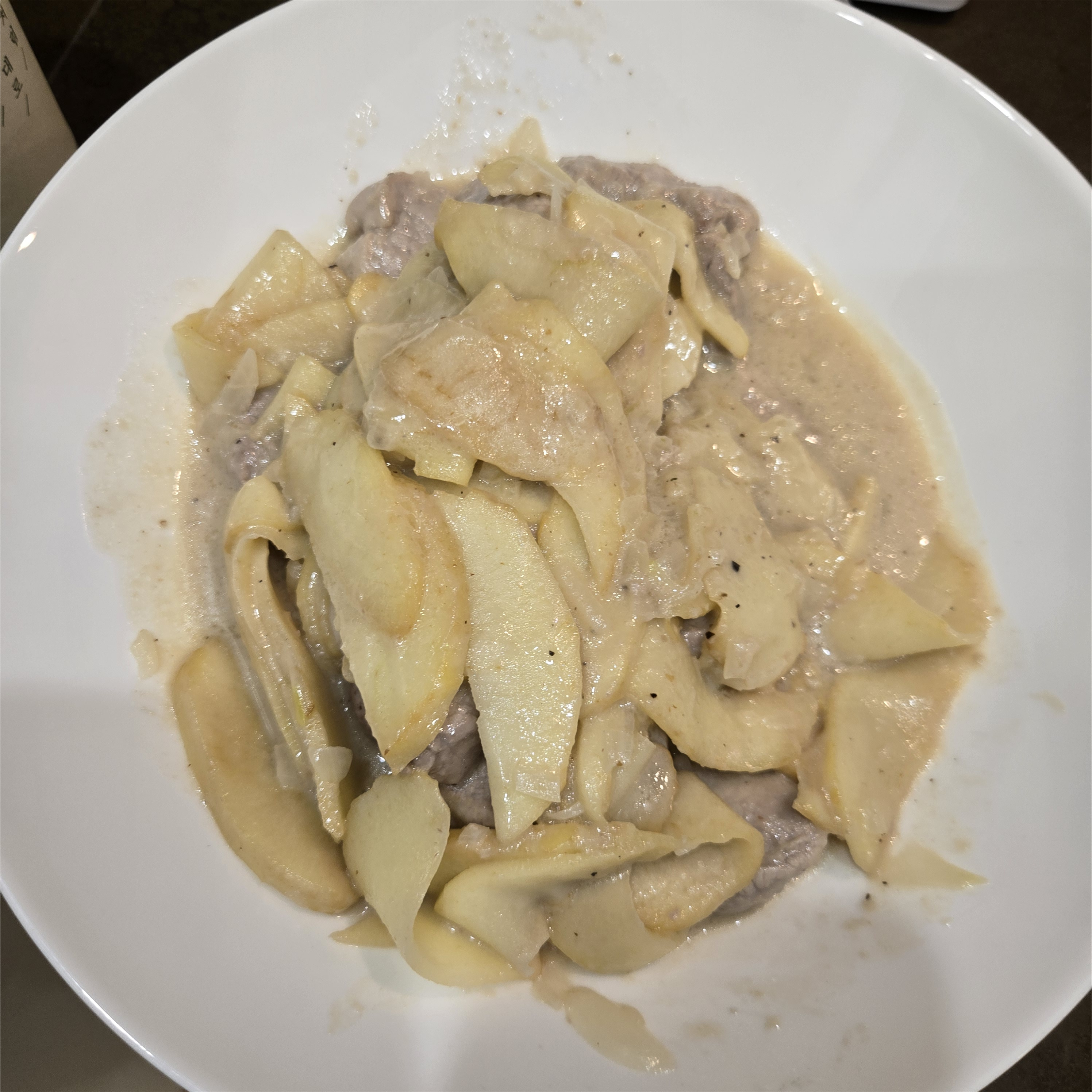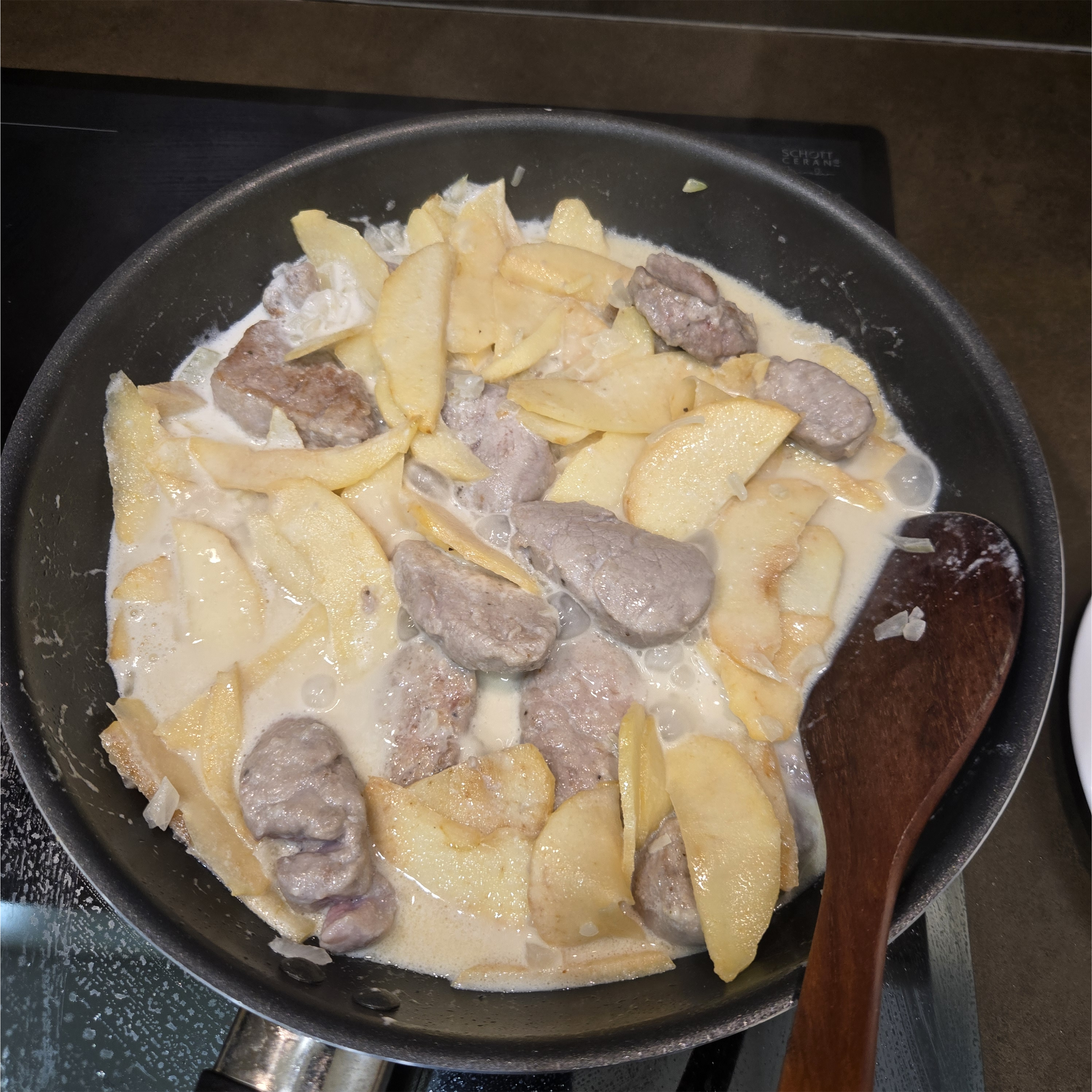 와인이 적당히 날아가면 크림 반 컵이랑 물 반 컵을 넣고 끓인다. 끓고 난 후에 볶은 사과랑 표면을 구운 고기를 넣고 크림이 걸쭉해질 때까지 졸여 준다.