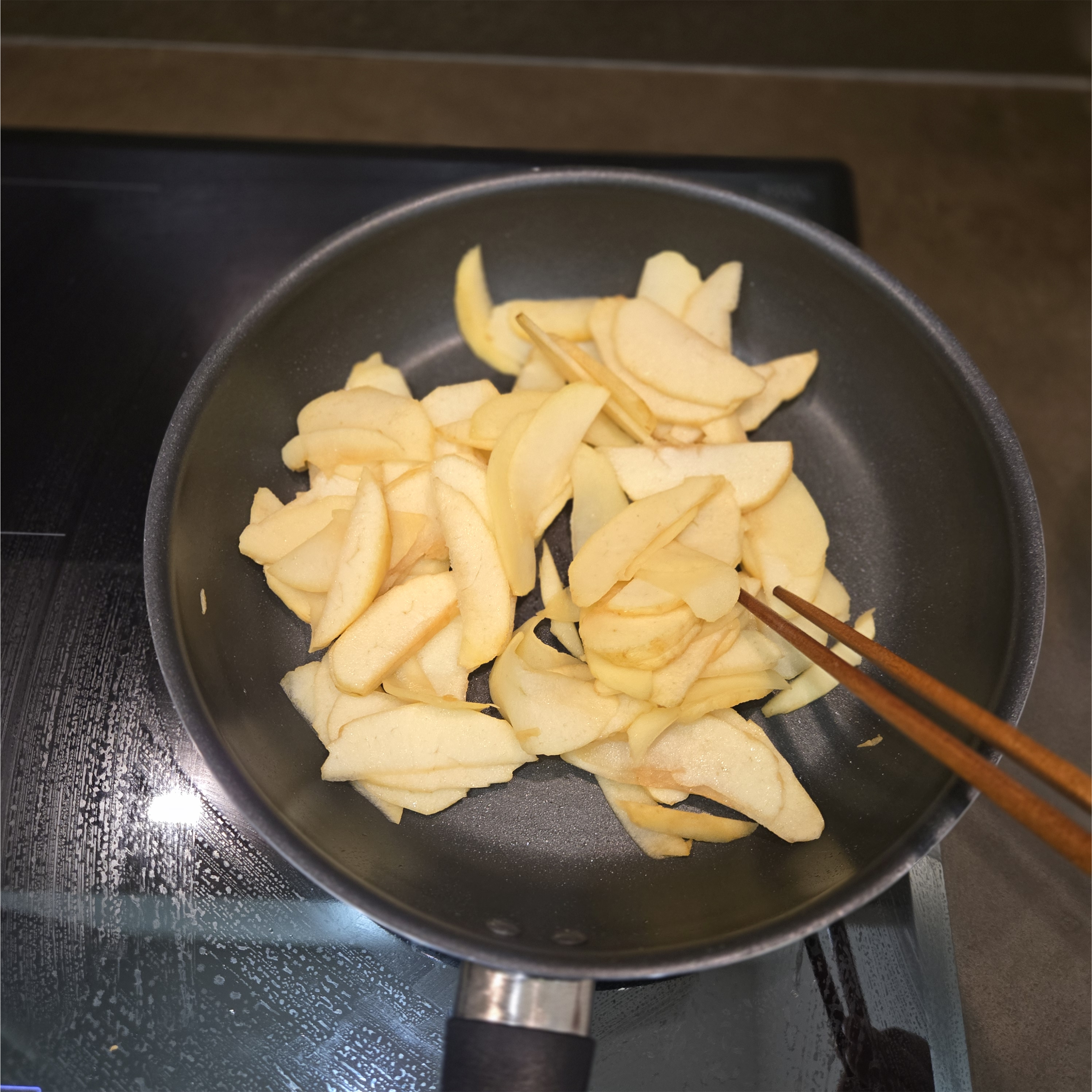 사과는 버터에 볶아 준다. 따끈하고 살짝 말랑해진 사과는 정말 맛있다. 살짝 노릇해질 정도로 구워야 한다고 했는데, 사과 깎는 데에 한시간 반이나 걸려서 사과가 이미 갈변으로 노릇해져서 조금 어려웠다.